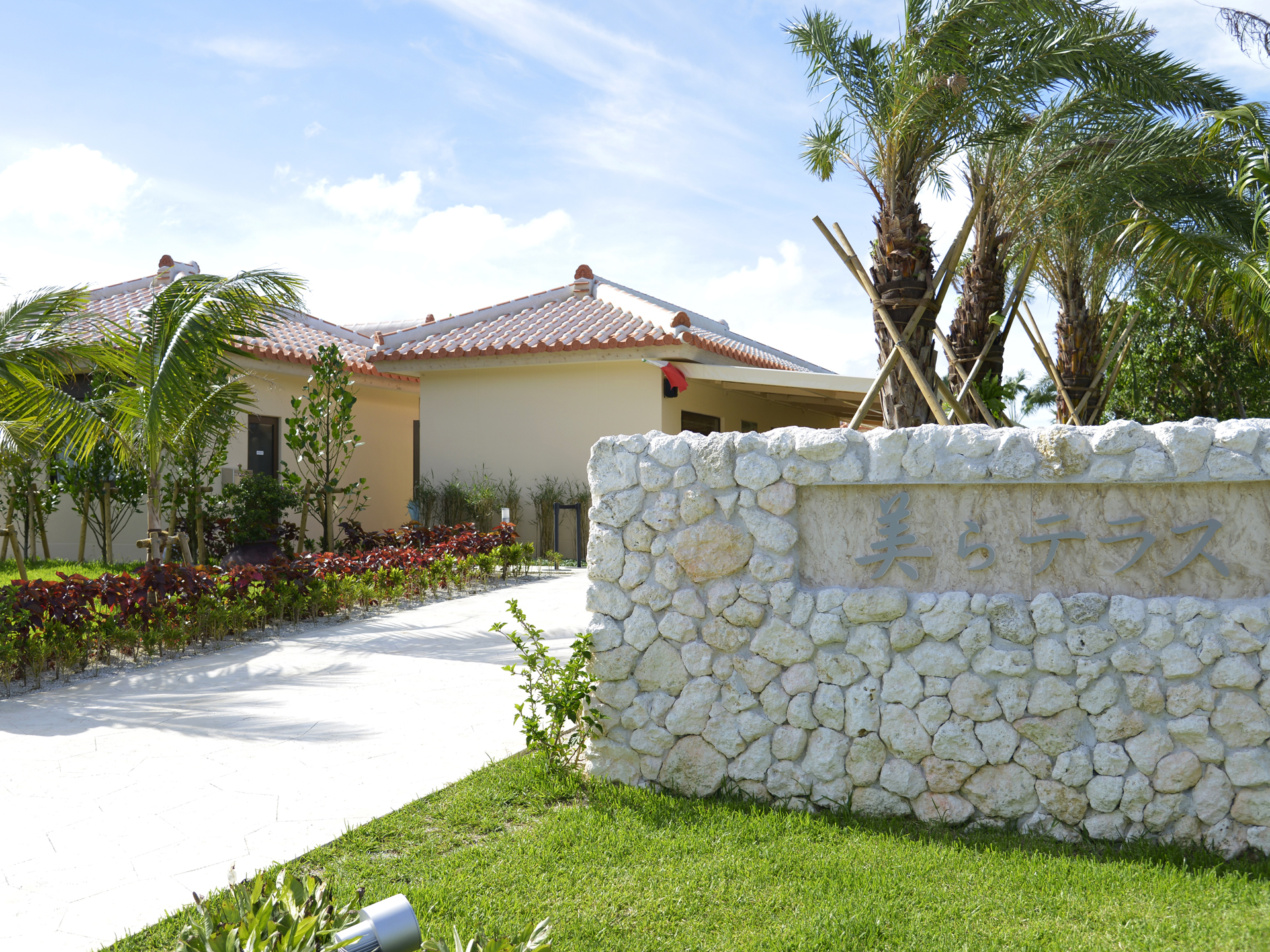沖縄本島から古宇利大橋を渡る手前にある、「美らテラス」は北部ドライブの休憩スポットにぴったり。赤瓦屋根の外観は、ホテルのリゾートのような佇まいで、開放的な敷地内では青い海と古宇利島の絶景が望める。
