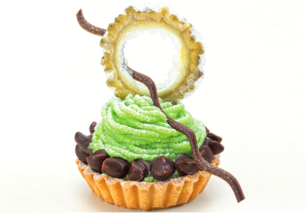 ゴーヤーとバターを練り込みゴーヤー色に仕立てた白あんでパイナップルブリュレを包み、ゴーヤーチップを飾りつけたその姿は、まさにゴーヤーモンブラン。