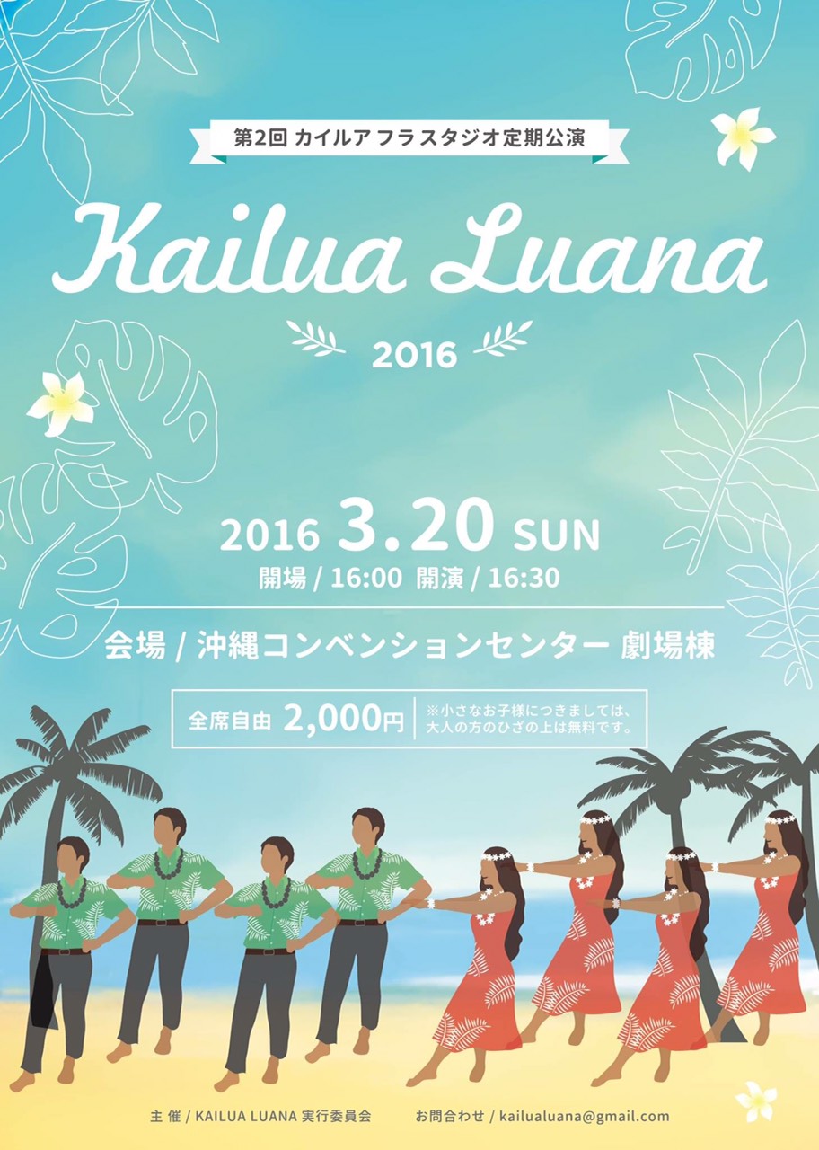 北谷町美浜を中心に活動するカイルアフラスタジオが、3/20(日)、沖縄コンベンションセンター 劇場棟でハワイアンフラショー「KAILUA LUANA2016~もうすぐ5周年だよ~」を開催する。去年の初公演から好評につき、総勢100名によるワンマンショーの開催を決定!