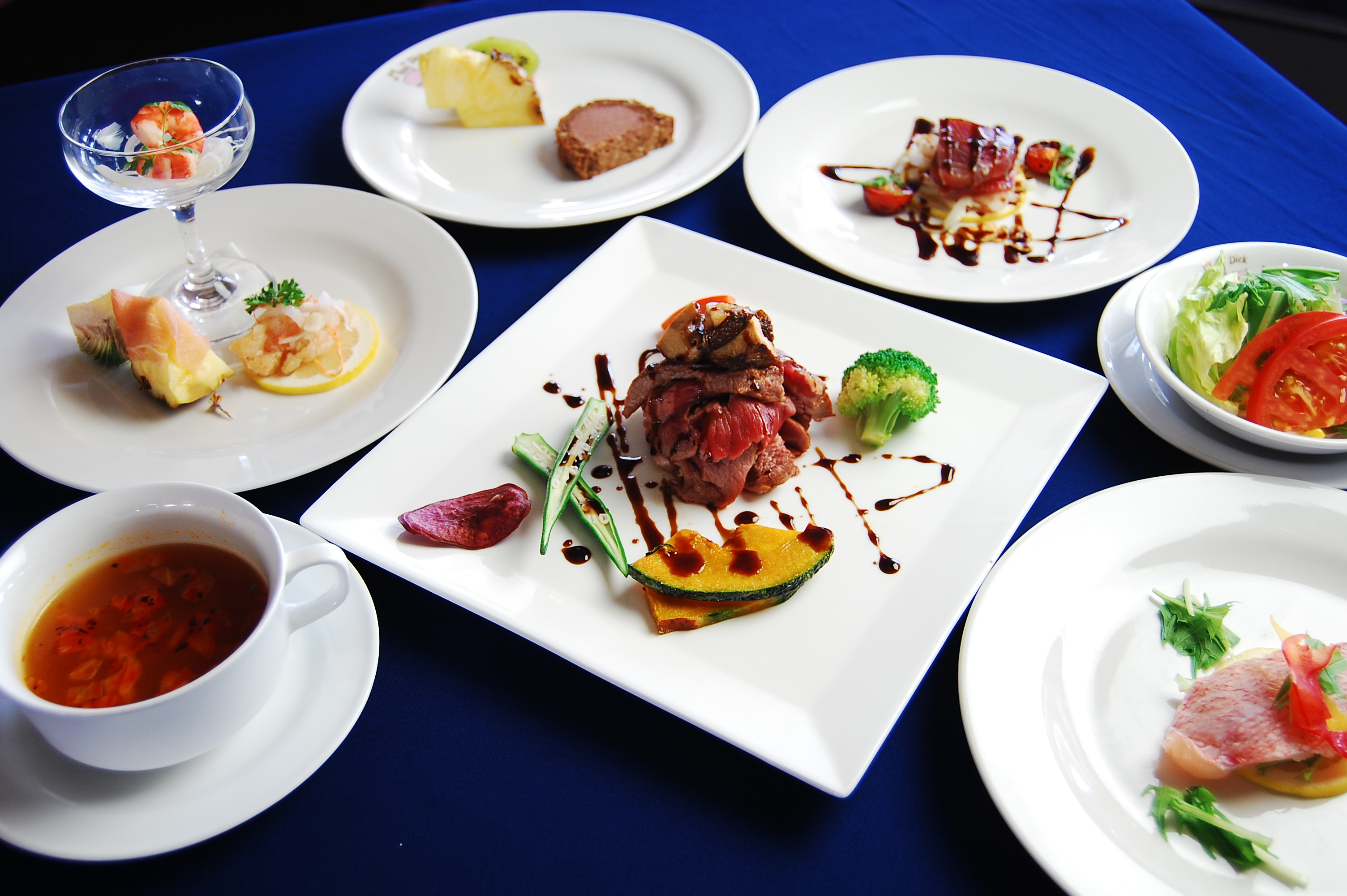 コース料理は本格洋食を中心とした5つのグレードから選択可能。予算と好みの料理に合わせたプランを楽しめる。