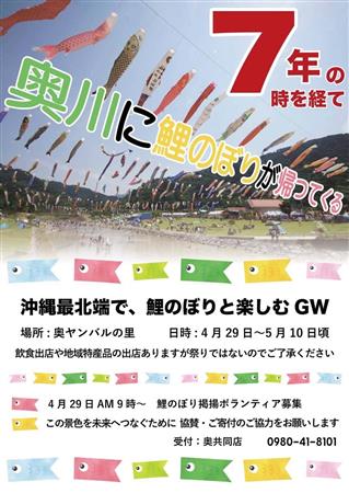 7年ぶりの鯉のぼり掲揚!ゴールデンウィークは奥ヤンバルの里で自然を満喫しながら鯉のぼりの姿を楽しもう♪