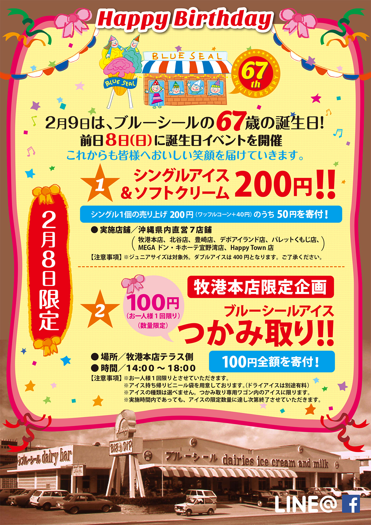 2月9日(月)で創立67周年を迎える「ブルーシール」が、前日の8日(日)に各店舗で誕生日イベントを開催する。