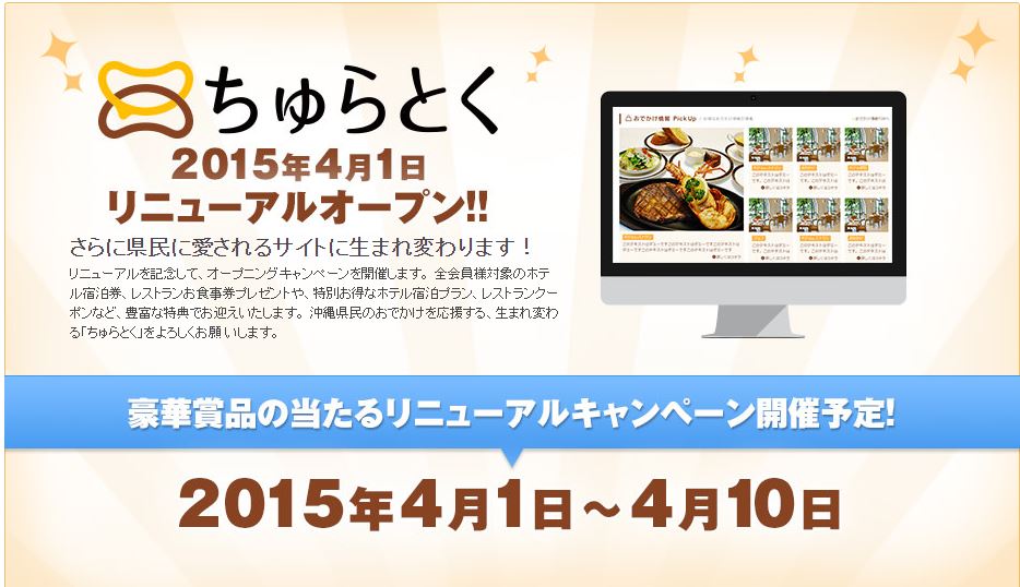 2009年の誕生以来、ホテル予約サイトとして皆様にご愛顧いただいている「ちゅらとく」は、4月1日(水)に沖縄県民限定の総合レジャー情報サイトとして生まれ変わります。