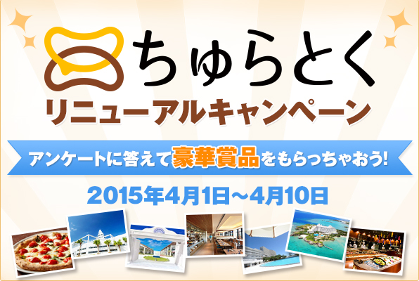 期間中、「ちゅらとく」サイト内の特設ページから新サービスに関するアンケートに回答いただくと、「オキナワ マリオット リゾート&スパ」、「ホテル オリオン モトブ リゾート&スパ」などの人気ホテルの宿泊券のほか、レストランでのお食事券、レジャー施設の入場券などを合計354名様にプレゼントします。