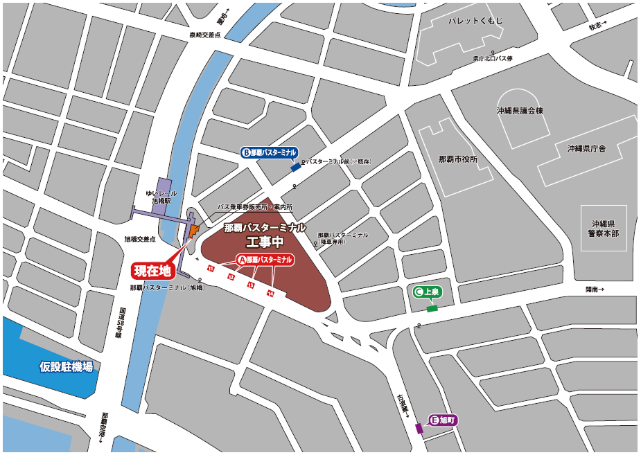 国道330号線沿いにある那覇バスターミナルの11番~14番ホームは、工事期間中もこれまで通り利用可能。それ以外の路線バス乗り場は、上泉・旭町・県庁北口・既存のバスターミナル前に移転した。工事中の那覇バスターミナルの道向かい(泉崎側)にあるバス停は、降車専用になっているので注意が必要だ。