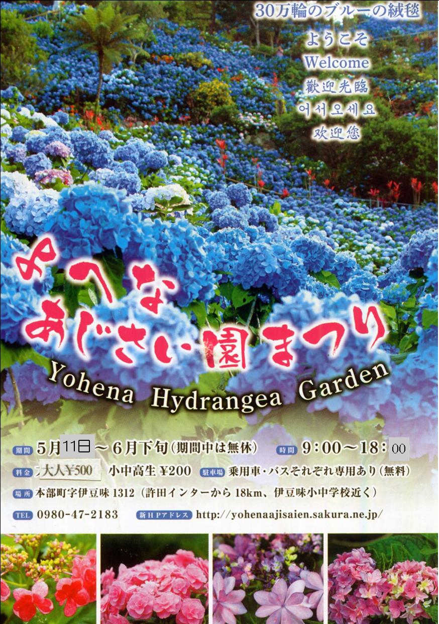 梅雨の時期に最も美しく咲き誇るあじさいは、見るものに感動を与え、初夏の訪れを感じさせる。愛情いっぱいに育てられた「よへなあじさい園」の約30万輪のあじさいは、今年も青や紫、ピンクや白と多彩な美しさで梅雨の時期を彩る。