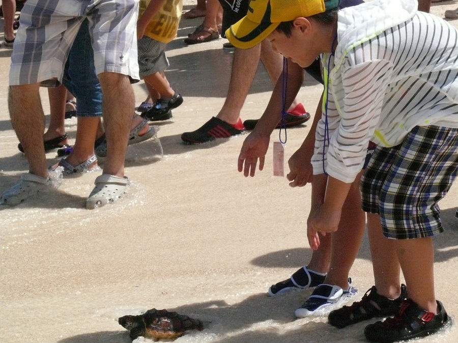 ふ化してから約1年間、海洋博公園で飼育されたウミガメの子どもを、海洋博公園の目の前にあるエメラルドビーチから放流させる。