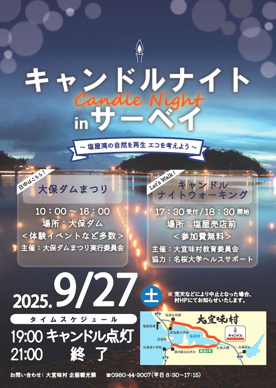2025年9月27日(土)、大宜味村にある塩屋湾の外周にキャンドルを灯し、沖縄八景といわれた景勝地の認知度を高め、湾内地域の活性化を目的として「キャンドルナイト in サーベイ」が開催。