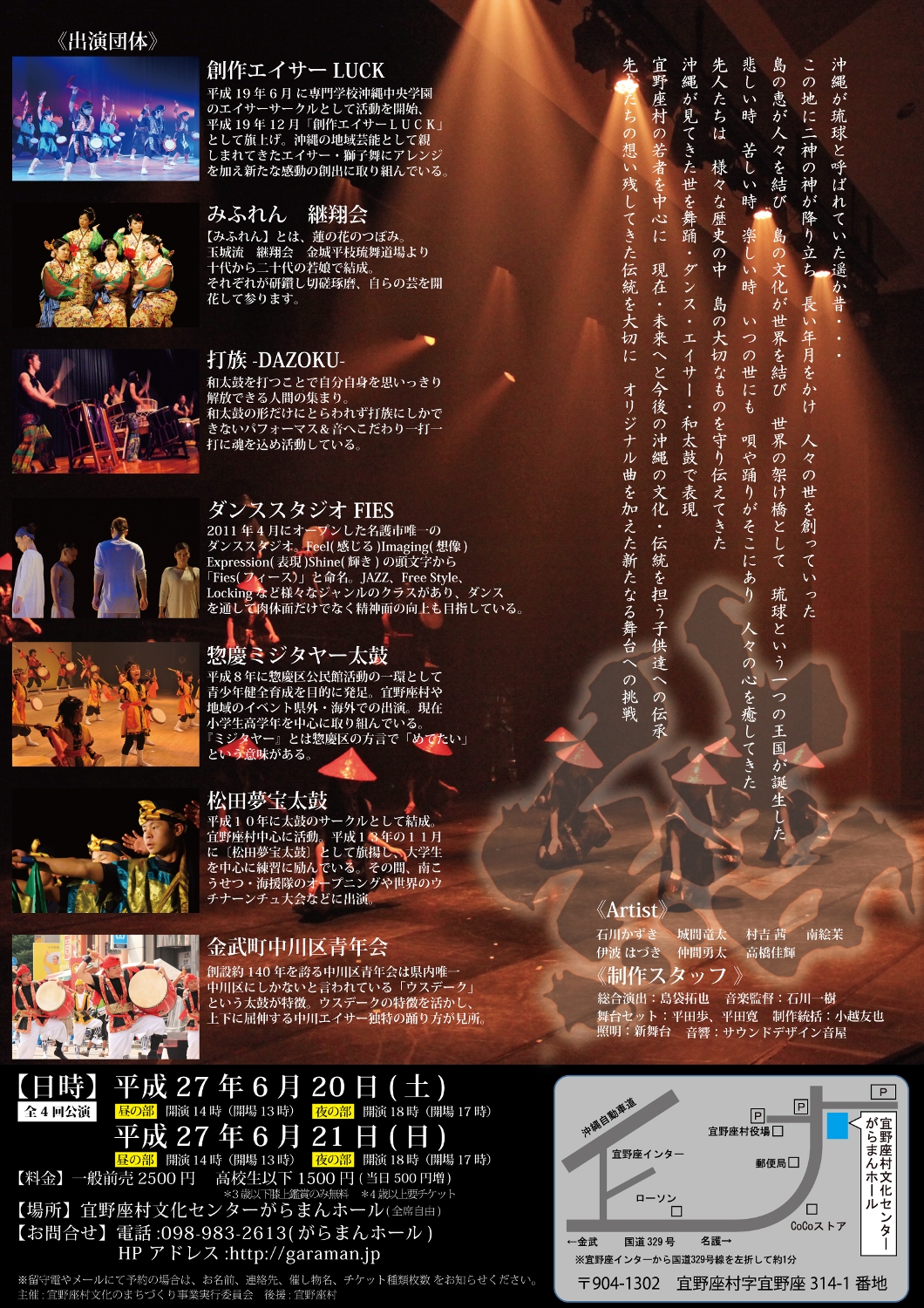 6月20日(土)、6月21日(日)、北部の宜野座村文化センターがらまんホールで地域の青年たちが主となり、沖縄が見てきた世を舞踊・ダンス・エイサー・和太鼓で表現するオリジナルの舞台が開催される。