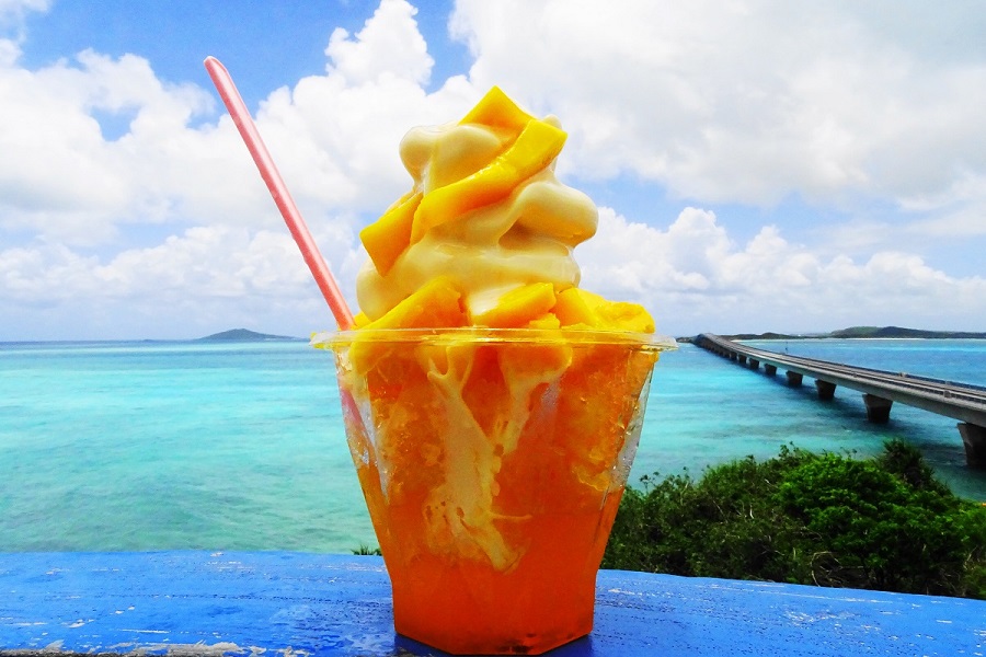 そんな「海美来」でこの時期に人気を集めているのがこのマンゴーフラッペ。かき氷の上にソフトクリーム、そして生のマンゴーがたくさん盛られたボリュームたっぷりのスイーツだ。量は多いが、マンゴーが甘すぎず爽やかな後味なのであっという間に完食できる。池間大橋や大神島を一望できる3階の展望台で食べるのがおすすめだ。
