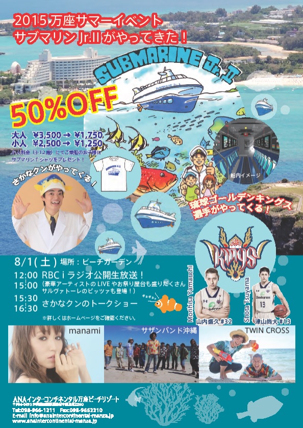 8月1日から新しく運航する「サブマリンJr. Ⅱ」の記念イベントで、通常料金の半額で「サブマリンJr. Ⅱ」に乗船でき、さらにサブマリンTシャツがもらえる(子どものみ)。そのほか、日本の魚類学者でタレントの「さかなクン」のトークショーや、manami、TWIN CROSSら沖縄アーティストによる音楽ライブが行われるなど、イベントが盛りだくさんで1日中楽しめる。