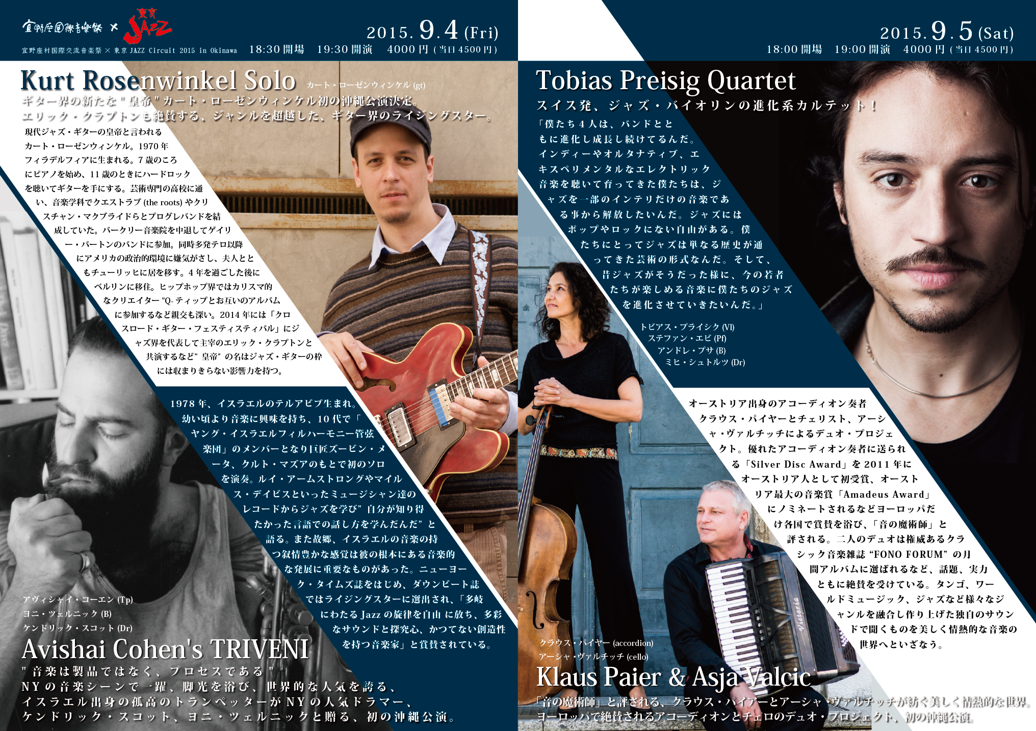 今回のコンサートでは、現代ジャズ・ギターの「皇帝」と呼ばれ、今話題のカート・ローゼンウィンケルやスイス発、ジャズ・バイオリンの進化系カルテットトビアス・プライシク、「音の魔術師」と評されるクラウス・パイヤーとアーシャ・ヴァルチッチのデュオなどが出演する。