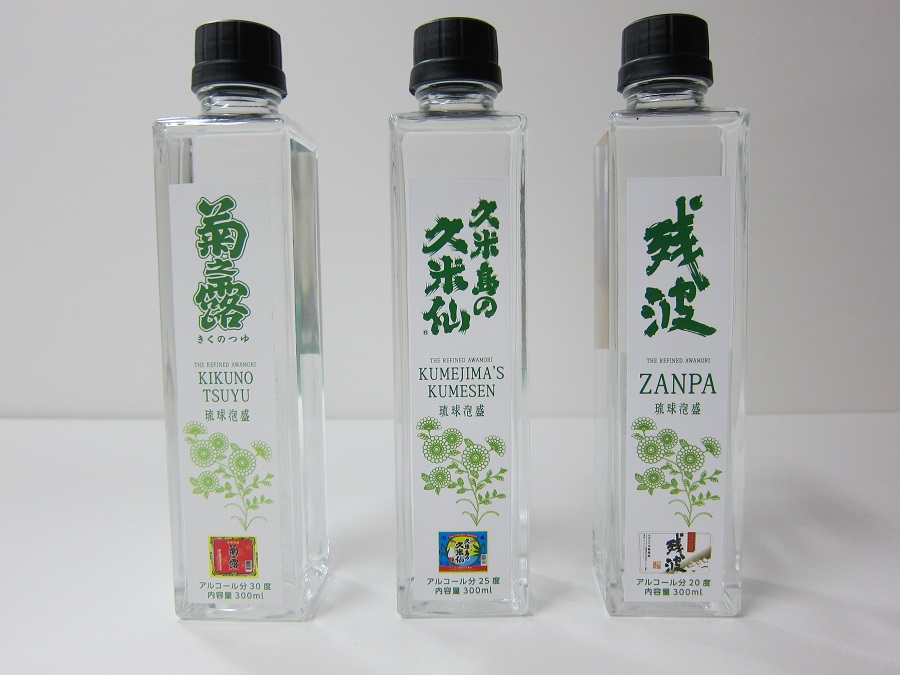 全国的に有名な泡盛の3酒造所「菊之露酒造」「久米島の久米仙」「比嘉酒造」の人気銘柄「菊之露」「久米島の久米仙」「残波」がスリムでおしゃれなボトルにデザインを一新。透明ボトルに花模様が入っていて、女性でも手に取りやすい。各銘柄のボトルラベルと商品名のフォントは、従来のボトルに使われているものをそのまま採用している。