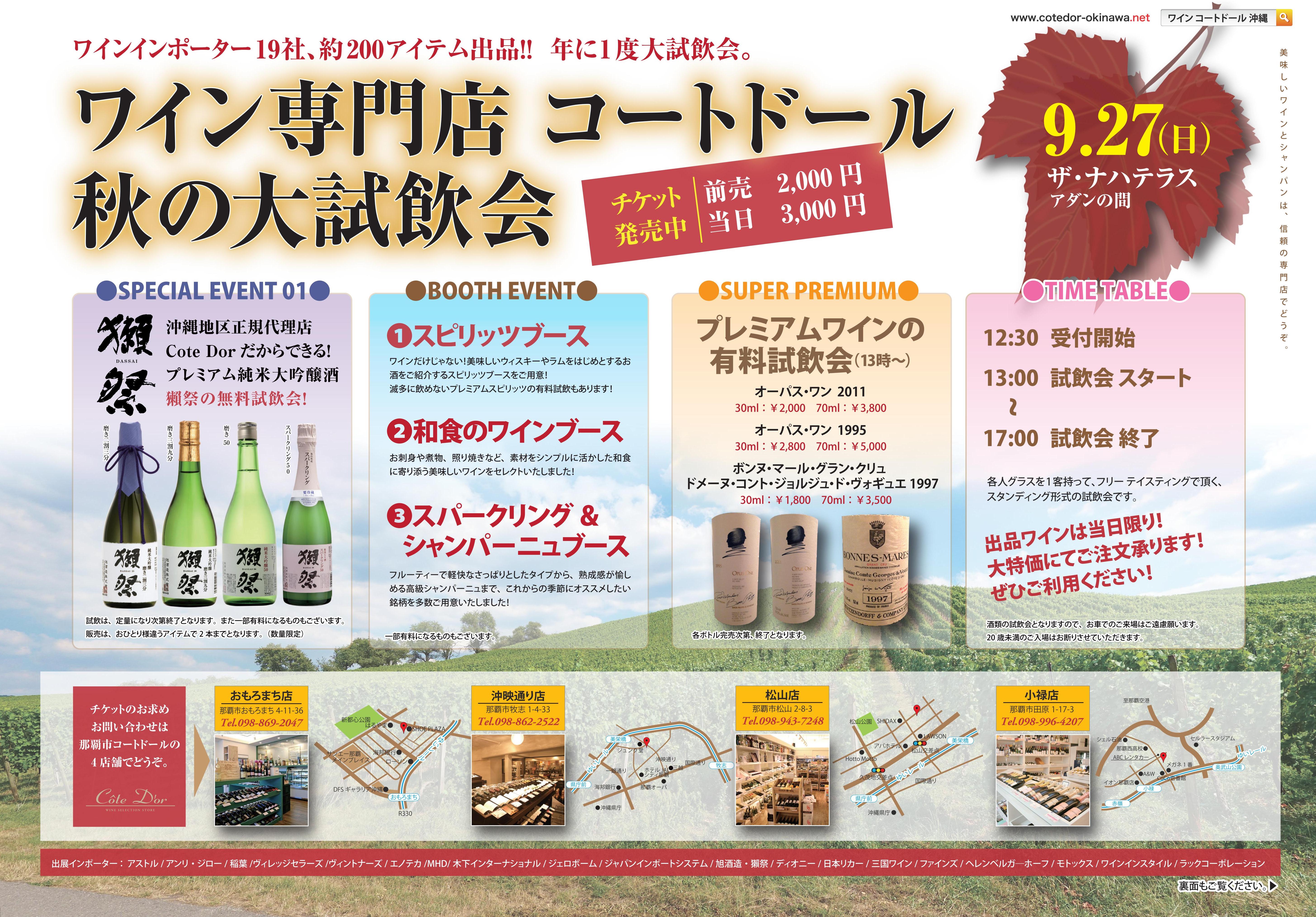 世界中のワインを集めたワイン専門店「コートドール」が、9月27日(日)にザ・ナハテラス・アダンの間で、ワインの大試飲会を開催する。