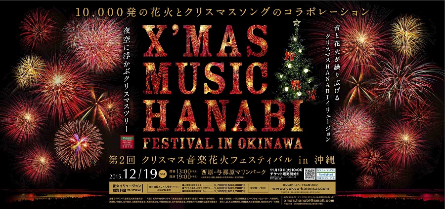 今年は会場が「西原・与那原マリンパーク」。クリスマスソングに合わせて、約1万発の花火が打ち上げられる。野外で長時間の開演になるので、もしもの為に雨具やレジャーシート等を用意して行くのがおすすめ。