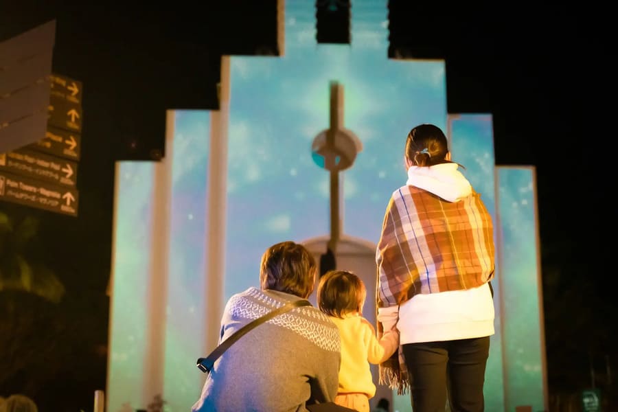 カヌチャステラ教会を中心としたスポット「ステラパークアベニュー」には、光のブランコやルミナスタワーが配置され、さらに光のトンネルをくぐり抜けるとそこにはSWEETハートが登場。カヌチャステラ教会に映るプロジェクションマッピングを、ベンチで休みながら眺めるのもおすすめだ。