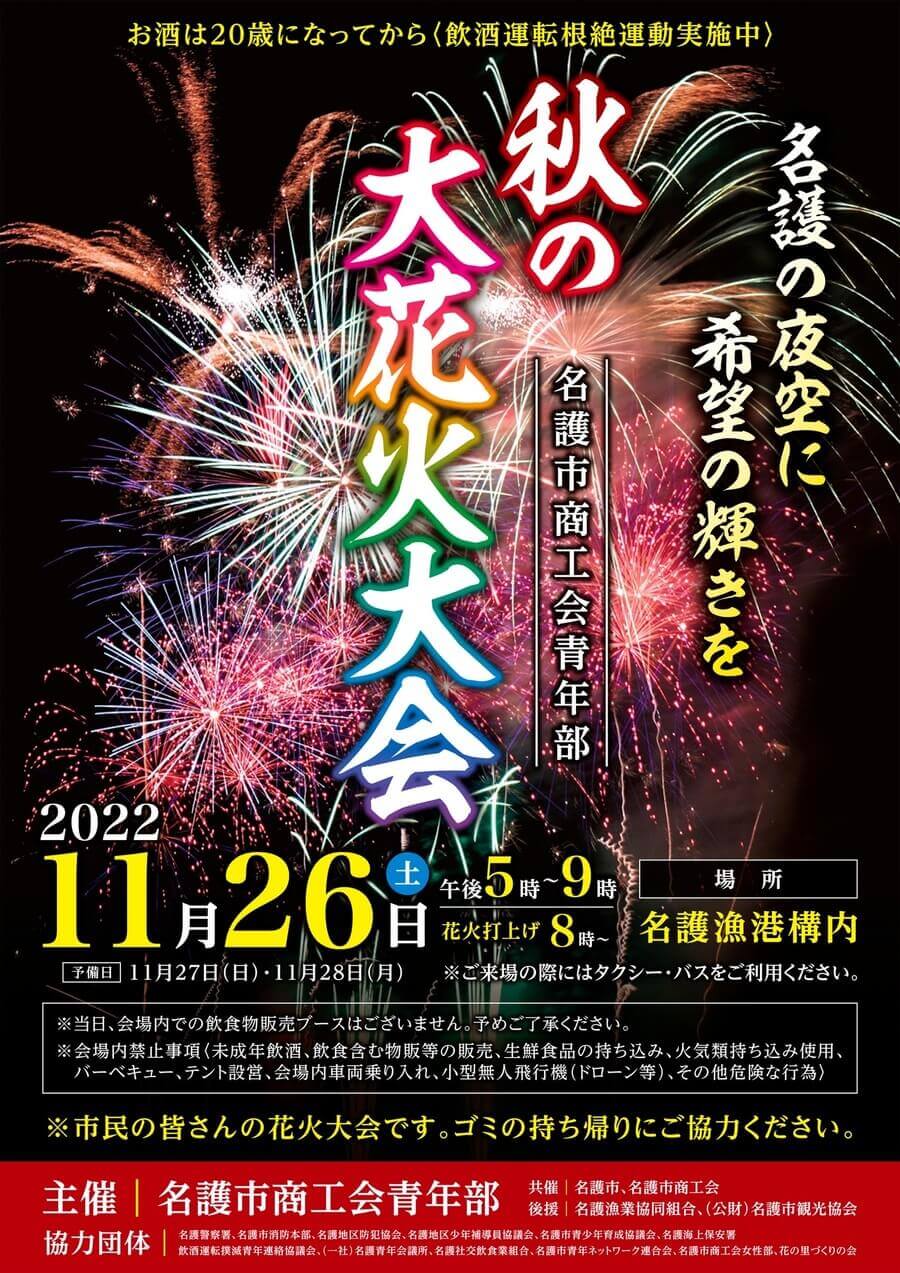 2022年11月26日(土)、名護市名護漁港内において名護市商工会青年部主催の「秋の大花火大会」が開催される。
