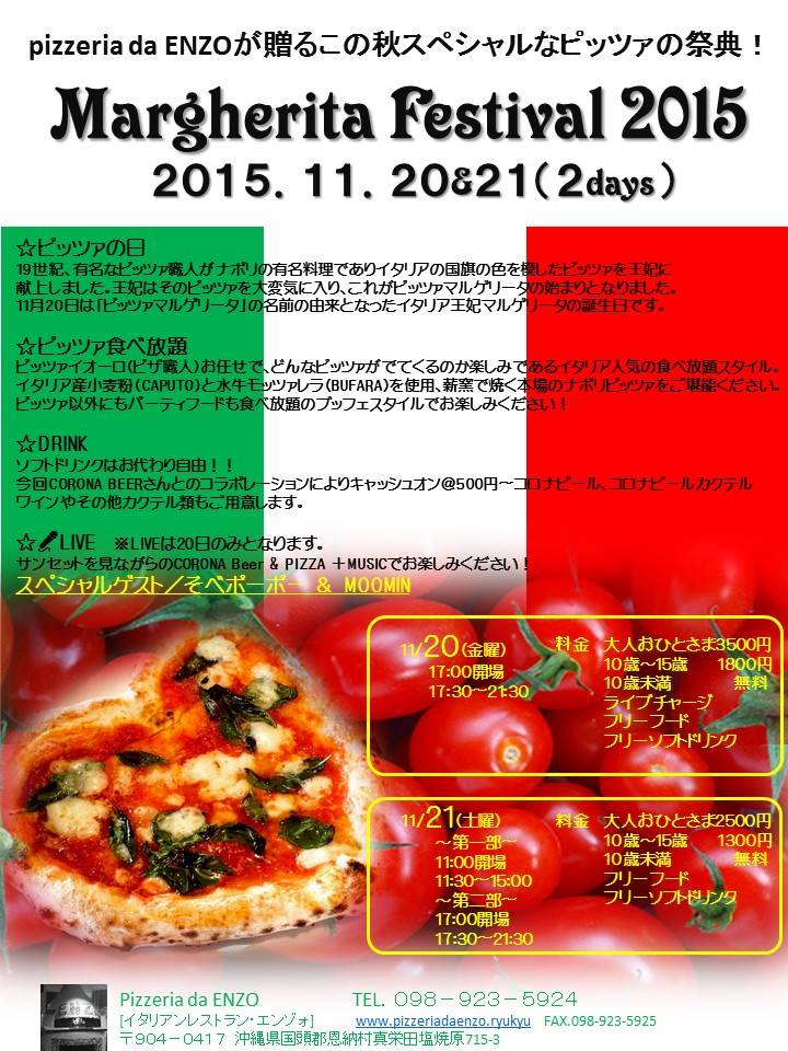 11月20日(金)、21日(土)の二日間、イタリア産小麦粉と水牛モッツァレラを使用した本場のナポリピザが食べ放題。20日は人気レゲエシンガーのMOOMINと沖縄出身の「そべポーポー」のLIVEが楽しめる。