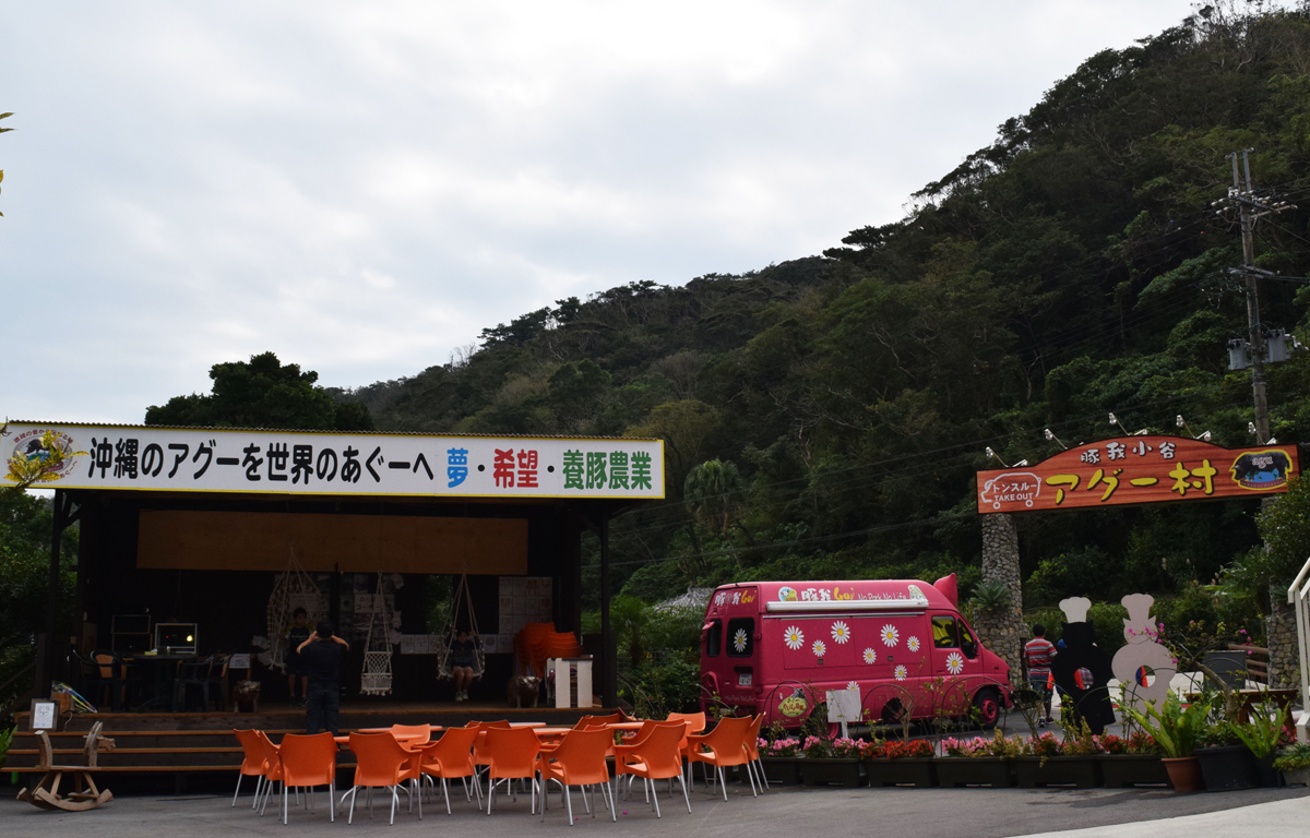 食べるだけではなく、実際にアグーを見てふれあい、感謝して食べてもらいたいと考え、我那覇畜産が名護市にオープンしたのが「アグー村」。「アグー村」は、やんばるの自然豊かな山の中、小さな谷のような場所にある。