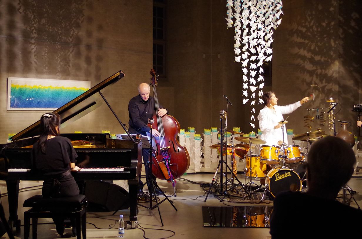 「マキコヒラバヤシピアノトリオ」のドラマーは、マイルスデイビスバンドのパーカッショニストとしても活躍したマリリン・マズールさん。ベースは夫のクラウスさん、ピアノはデンマーク在住のマキコヒラバヤシさんだ。