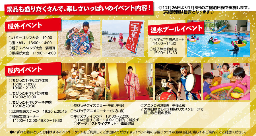 また、屋外イベントとして子どもに大人気の「宝探し」や「パターゴルフ」、「親子フィッシング大会」、「凧揚げ大会」が開催。冬のビーチで思いっきり遊ぶことができる。そのほか、「ちびっこ手作り工作体験」や「ちびっこ手作りケーキ体験」、「琉装写真コーナー」、「ちびっこクイズラリー」、「キッズプレイランド」など屋内イベントも充実。雨の日でも安心だ。