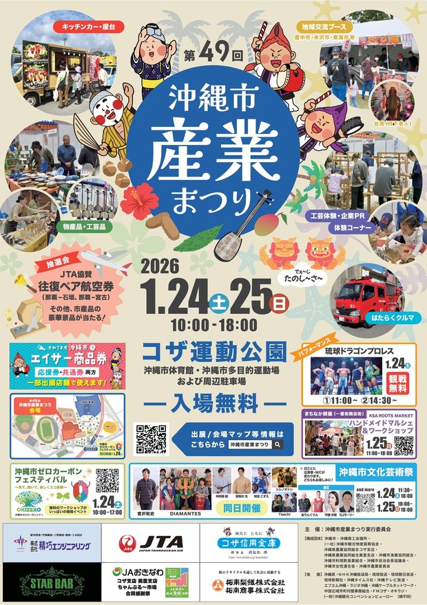 沖縄市のコザ運動公園で、2026年1月24日(土)・25日(日)の2日間、「第49回 沖縄市産業まつり」が開催される。沖縄市自慢の食べ物や工芸品が会場にずらりと並び、工芸体験やワークショップも楽しめる、毎年人気のイベントだ。