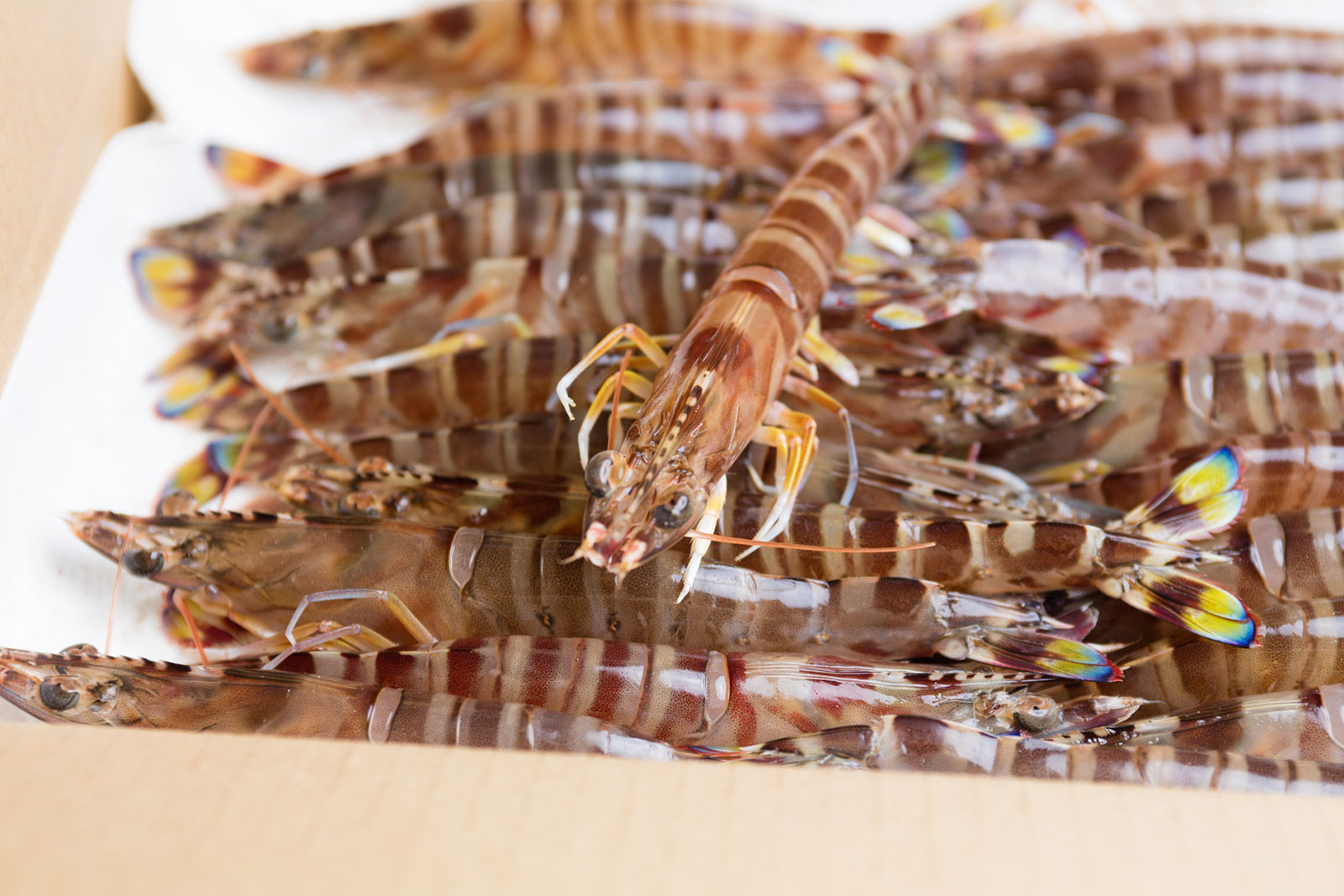 滑らかな甲羅に、濃い色の縞模様、尾に青と黄色のコントラストが美しいクルマエビ。