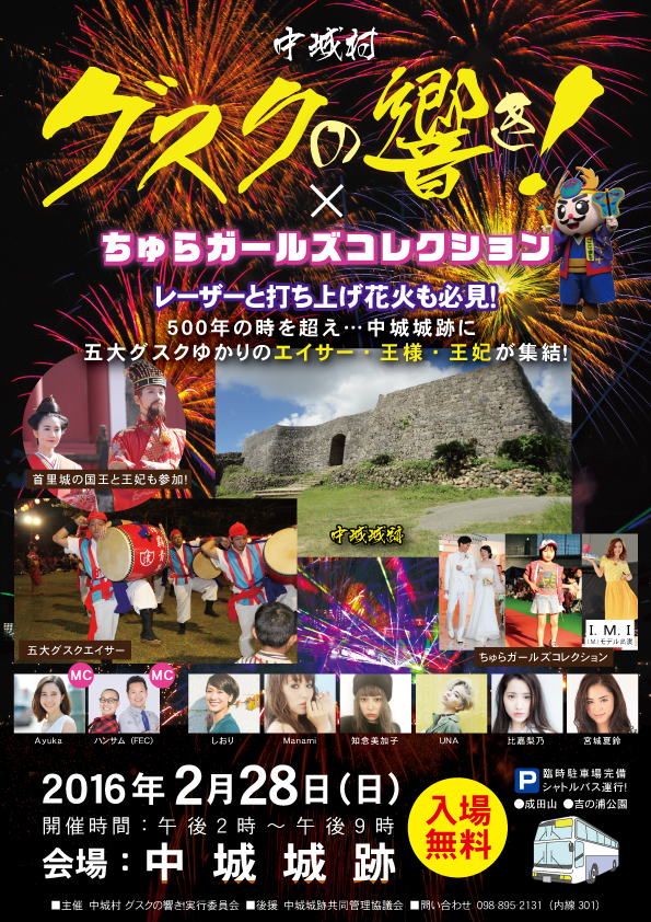 2016年2月28日(日)、中部の中城村にある世界遺産・中城城跡で「グスクの響き×ちゅらガールズコレクション」が開催される。