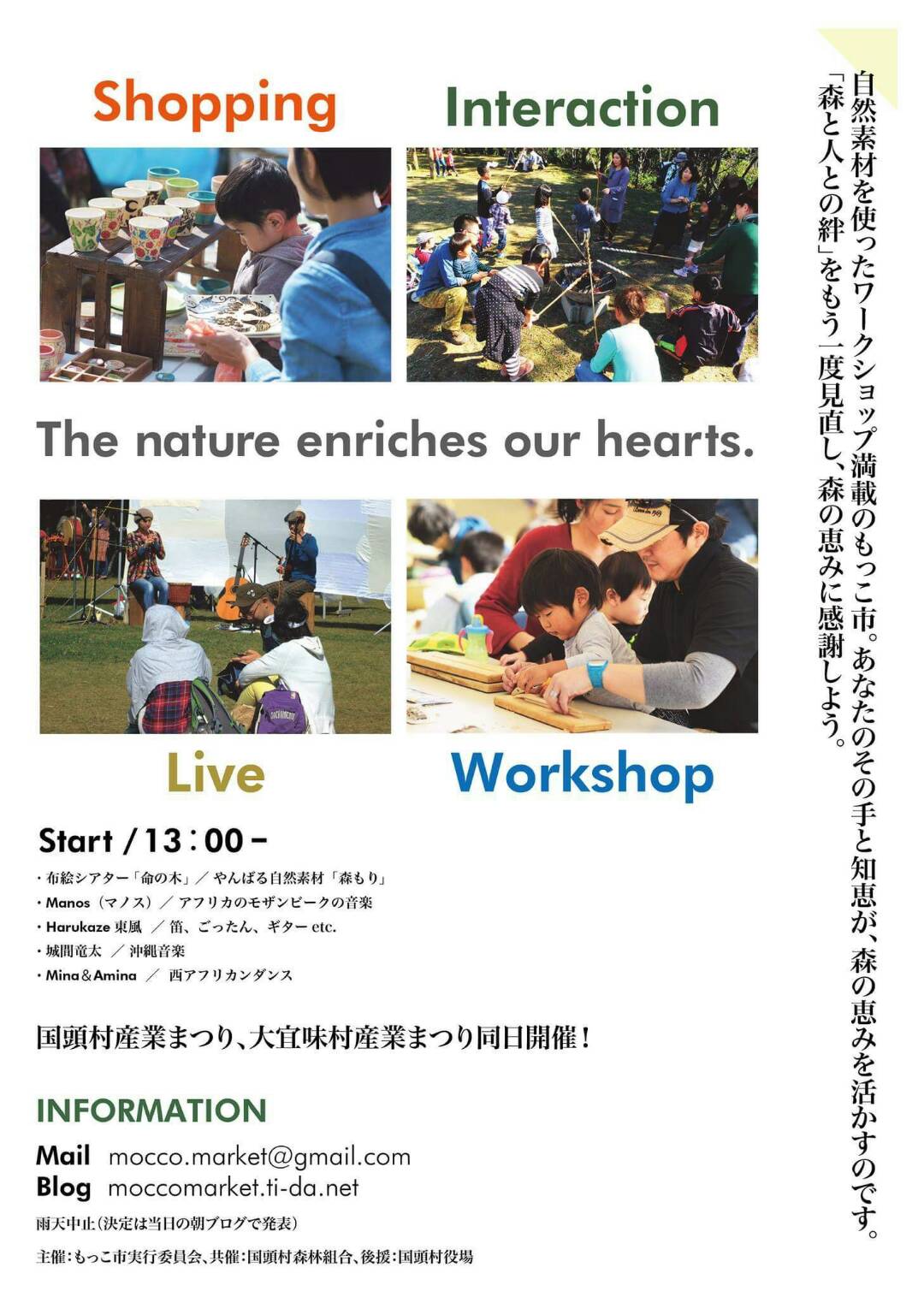 もっこ市は、やんばるの森の恵みを感じ、感謝し、森と人のつながりを再認識、発見することを目的としたイベント。名前の意味は「木工」「森の子」「もこもこ」。森と人が「もっと」いい関係になるようにという想いも込められている。