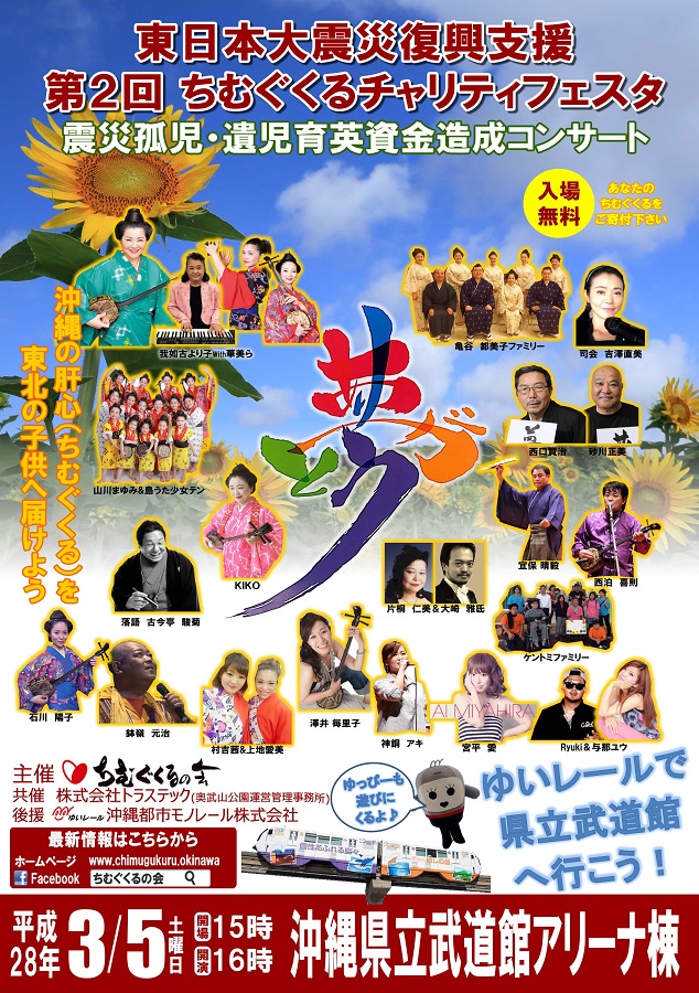 3月5日(土)、那覇市の沖縄県立武道館で東日本大震災復興支援「ちむぐくるチャリティフェスタ」が開催される。「ちむぐくる」とは、沖縄の言葉で「思いやりの心」。