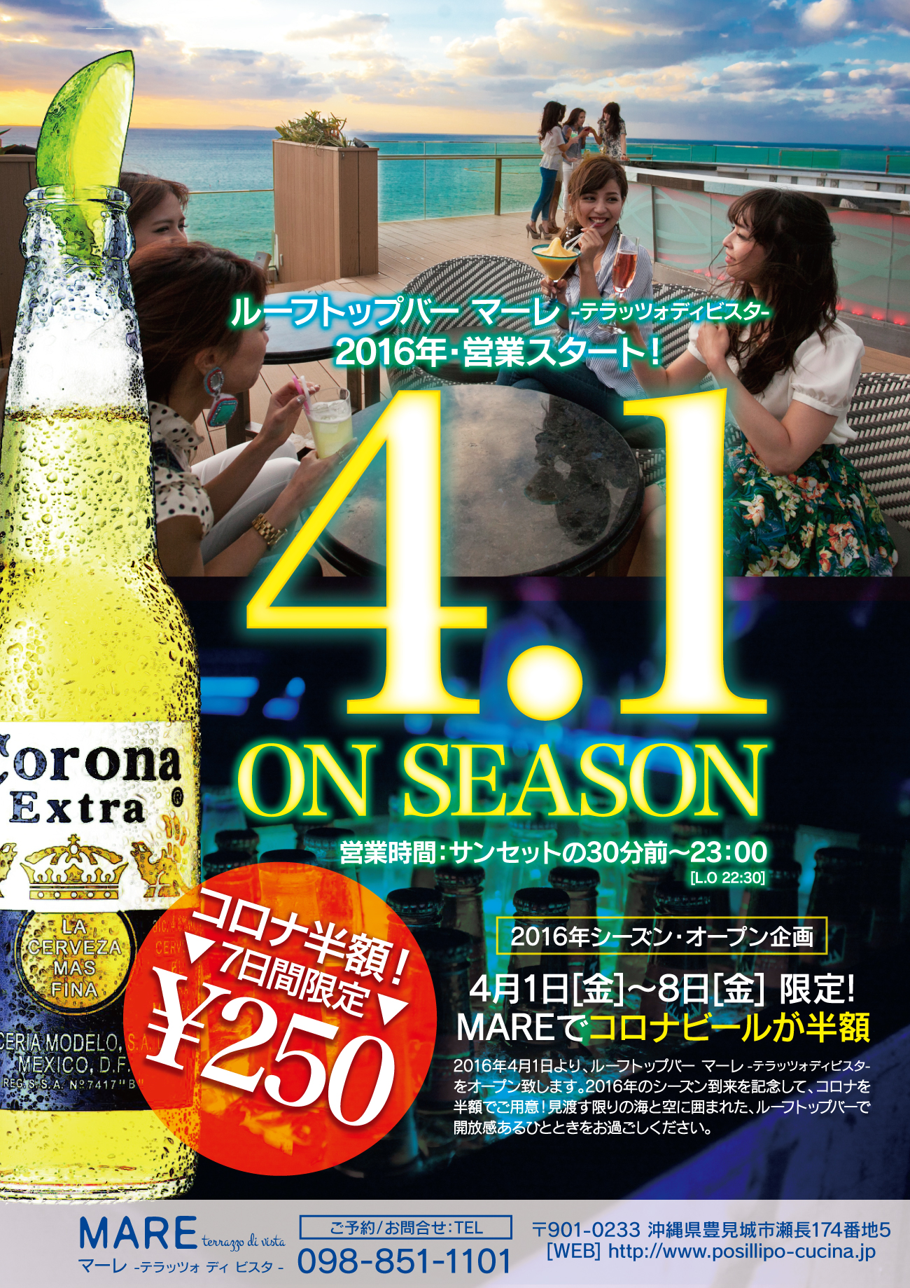 瀬長島にあるレストラン「POSILLIPO - cucina meridionale-& MARE-terrazzo di vista(ポジリポ・クッチーナ メリィディオナーレ&マーレ)」の屋上にあるルーフトップバー「MARE(マーレ)」が4月1日(金)より2016年シーズン・オープン。