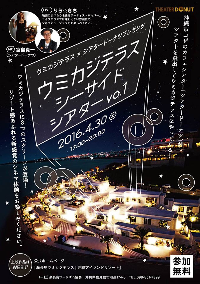 4月30日(土)、瀬長島のウミカジテラスで映画を上映するイベント「シーサイドシアターVO.1」が開催される。沖縄市コザにあるカフェシアター「シアタードーナツ」とのコラボレーションで実現。