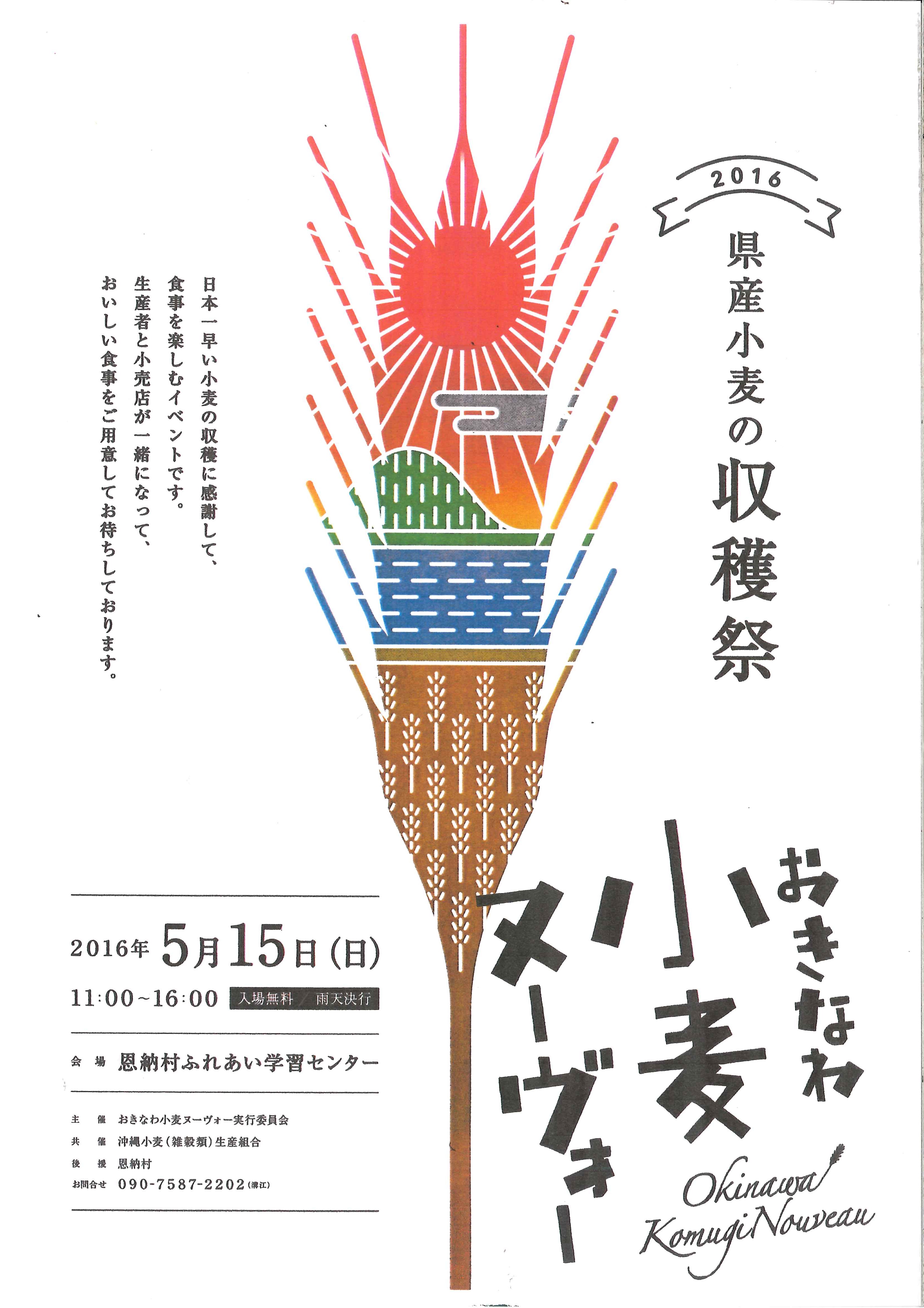 2016年5月15日(日)、沖縄県内(伊是名島、名護、金武町、恩納村、読谷村、うるま市、南城市)で今年収穫された小麦の収穫感謝祭「おきなわ小麦ヌーヴォー」が開催される。