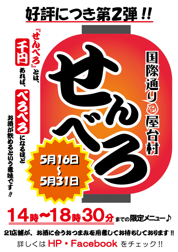 那覇市にある国際通り屋台村で、5月16日(月)~5月31日(火)まで千円ぽっきりでドリンクとおつまみがお得に楽しめる「せんべろ」フェアが開催されている。