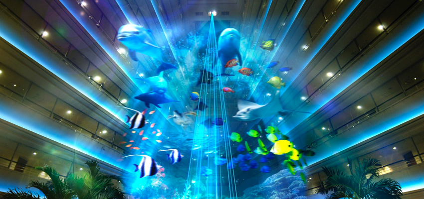 高さ25メートル、奥行き40メートルの巨大アトリウム全体で繰り広げられる県内最大規模のプロジェクションマッピングとウォーターパフォーマンスショー。