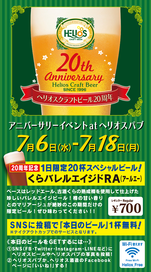 2016年7月6日(水)~7月18日(月)までの期間中、沖縄のクラフトビール「ヘリオスクラフトビール」製造販売開始から20年を記念して、アニバーサリーイベントが開催されている。