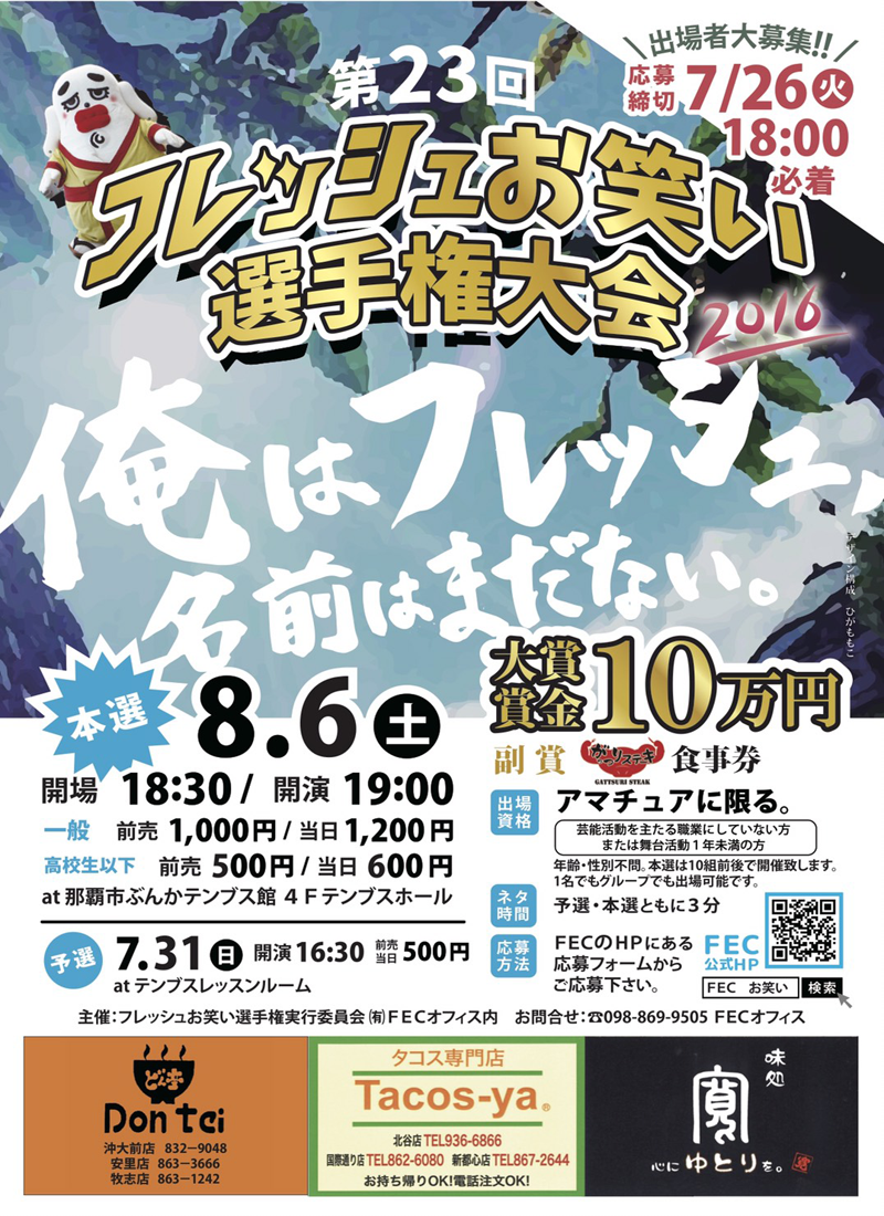 那覇市牧志にある那覇市ぶんかテンブス館で、8月6日(土)「フレッシュお笑い選手権大会」が開催される。