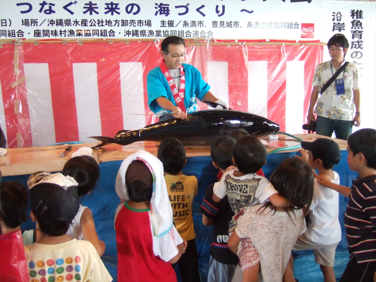 このまつりの特徴は、家族みんなで参加できるアトラクションや体験が多いということだ。キックターゲットや、マグロの解体ショー&模擬セリ、アームレスリング沖縄一決定戦などが楽しめる。