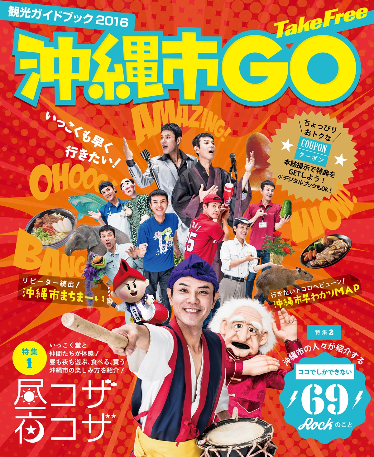 「沖縄市GO」は、沖縄市の遊び方を、ちゃんぷる~沖縄大使の「いっこく堂」さんが実際に体験&体感した第1特集と、「ココでしかできない69のこと」を紹介する第2特集の2部構成からなる沖縄市の観光情報誌。