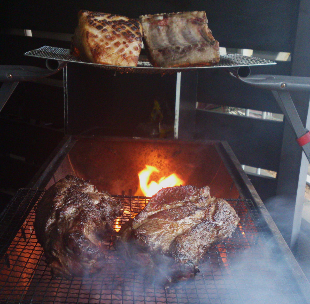 イノブタや羊のかたまり肉炭火焼のほか、前菜、パスタなどもお酒に合う料理も楽しめる。