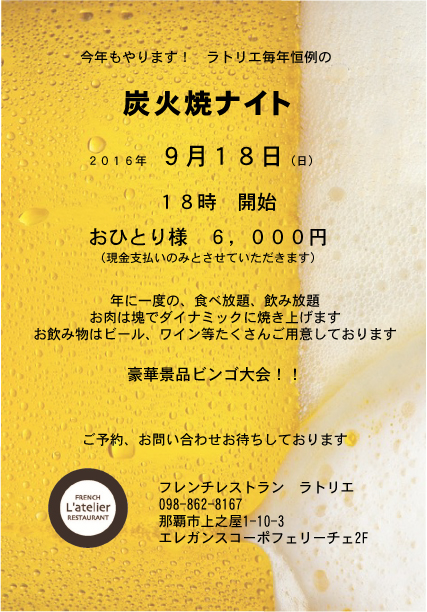 2016年9月18日、那覇市にあるフレンチレストランラトリエ(L'atelier)で年に一度の食べ放題、飲み放題の「炭火焼ナイト」が開催される。