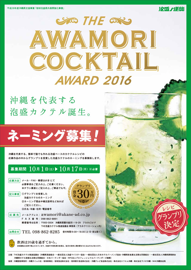 今回第二弾として、受賞した泡盛カクテルのネーミングを募集。期間は10月17日(月)まで、20歳以上の方なら誰でも応募可能、グランプリ賞金は30万円となっている。