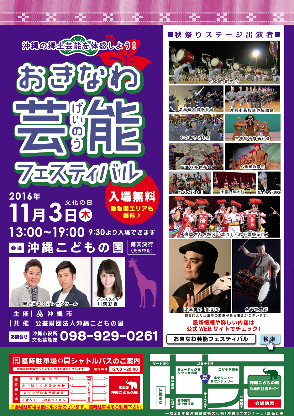 11月3日(木・祝)沖縄市にある「沖縄こどもの国」で沖縄の郷土芸能が堪能できるイベント「おきなわ芸能フェスティバル 2016」が開催される。
