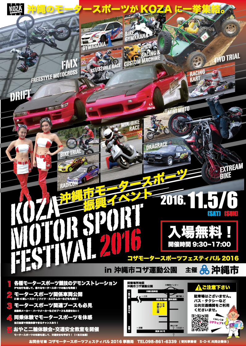 2016年11月5日(土)、11月6日(日) の2日間、沖縄市コザ運動公園でモータースポーツ振興イベントとして「コザモータースポーツフェスティバル2016」が開催される。