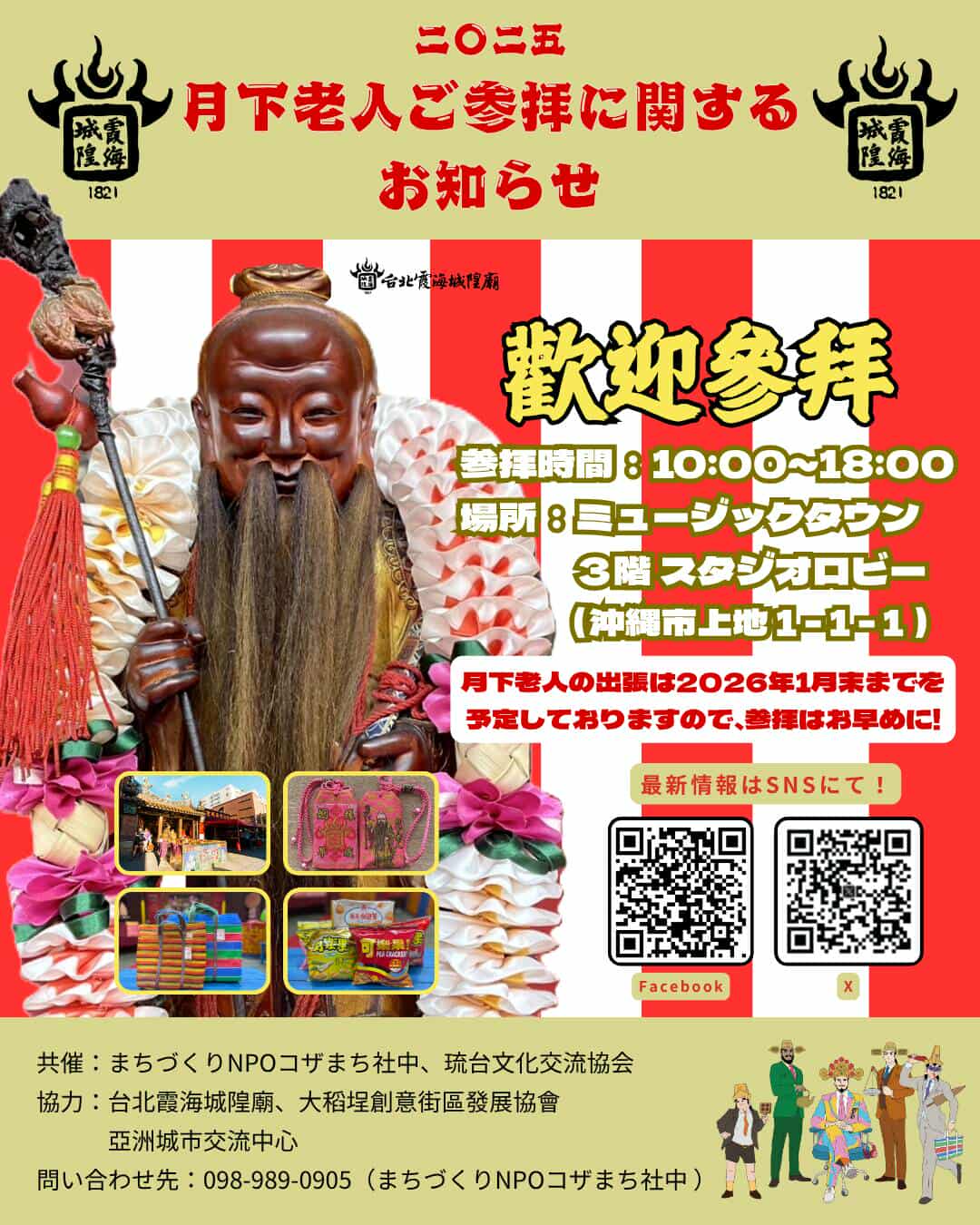 2025年11月22日(土)~2026年1月末までの期間中、沖縄市のコザ・ミュージックタウンに、台湾で有名な縁結びの神様“月下老人(ユエシァラオレン)“が祀られる。2025年11月22日(土)には、「沖縄国際カーニバル」のステージイベント内で月下老人のお迎え式を実施。