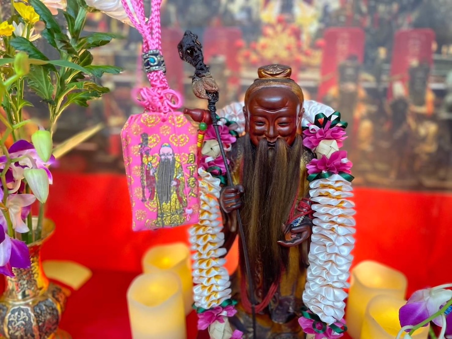 台湾では多くの廟に祀られている月下老人。今回、来沖しているのは、各所に祀られている月下老人の中でも特に有名な、台北霞海城隍廟(シアハイチェンホアンミャオ)というパワースポットの月下老人。縁結びが成就した人が年間平均6,000組以上もお礼参りに訪れており、そのご利益は折り紙つきだ。