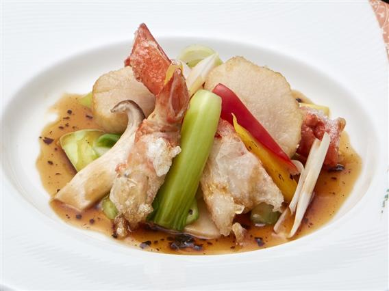 ・たらば蟹入り海鮮ライスペーパー包み翡翠ソース