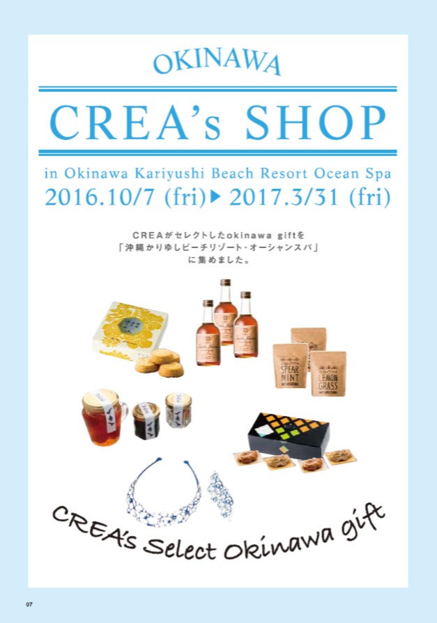 恩納村のホテル「沖縄かりゆしビーチリゾート・オーシャンスパ」内にある売店の一角に、女性ファッション雑誌“CREA”とコラボした「CREA's SHOP」が2016年10月7日(金)にオープンした。