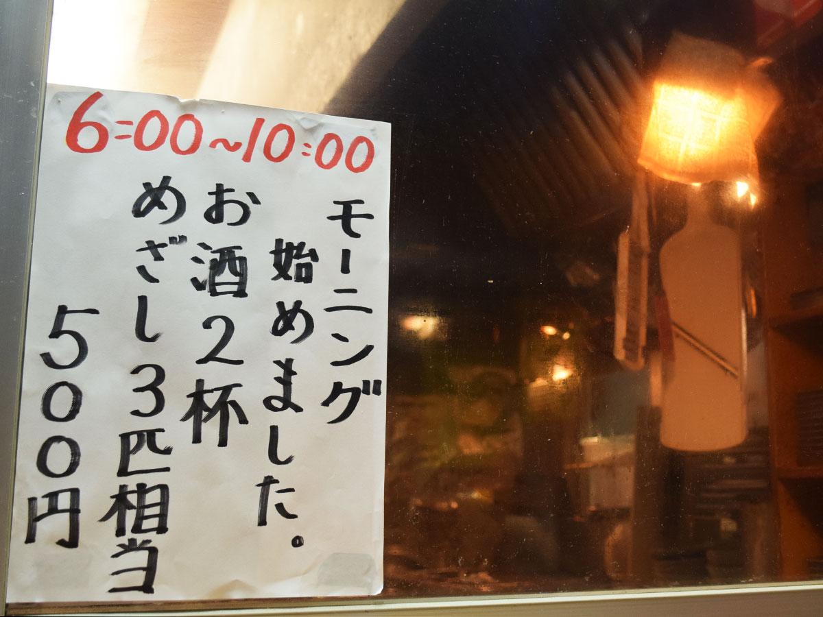 モーニングは「お酒2杯とめざし3匹」がなんとワンコインの500円。