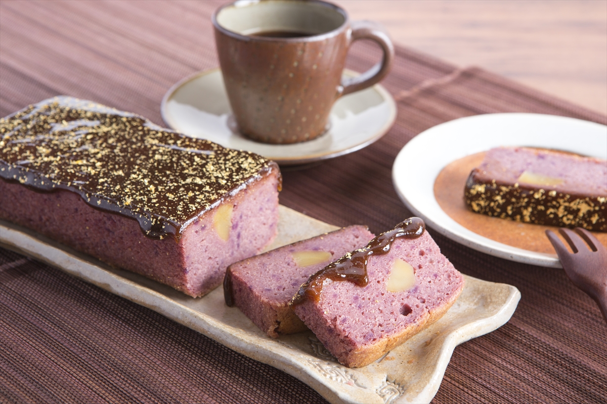 沖縄県宮古島産の紅芋「ちゅら恋紅」をベースとして、北海道産クリームチーズと生クリーム、ホワイトチョコを混ぜ合わせたガトーショコラに、波照間産100%の黒糖黒みつを流し、金沢金箔を散りばめた贅沢なチーズケーキ。